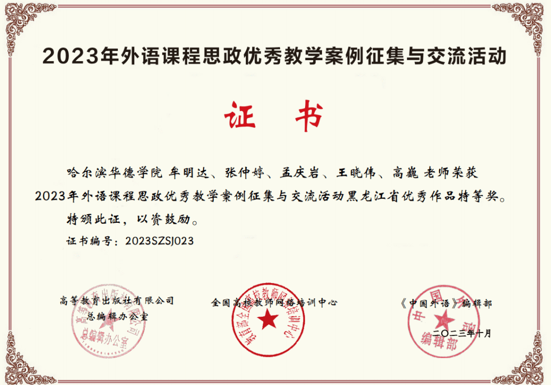 央广网哈尔滨11月13日消息 (记者马俊玮 通讯员张野默)近日,由教育部高等学校大学外语教学指导委员会、高等教育出版社、全国高校教师网络培训中心与中国外语编辑部共同举办的2023年外语课程思政优秀教学案例征集与交流活动的省级遴选与推荐阶段的成绩公布,哈尔滨华德学院通识教育学院公共外语教研室牟明达、张仲婷、孟庆岩、王晓伟、高巍团队通过两轮比赛的激烈角逐,荣获省级特等奖,并获得代表黑龙江省参加全国总决赛的资格。