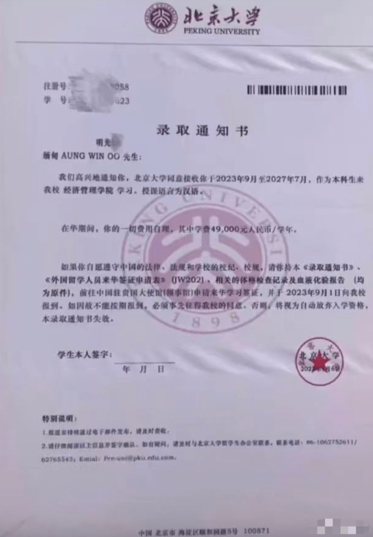 上游新闻记者从网传“北京大学录取通知书”截图看到:“缅甸明光忠,我们高兴地通知你,北京大学同意接受你于2023年9月至2027年7月,作为本科生来我校经济管理学院学习,授课语言为汉语……”另外,还有多张明学昌与明光忠在“升学宴”上的庆祝图片。