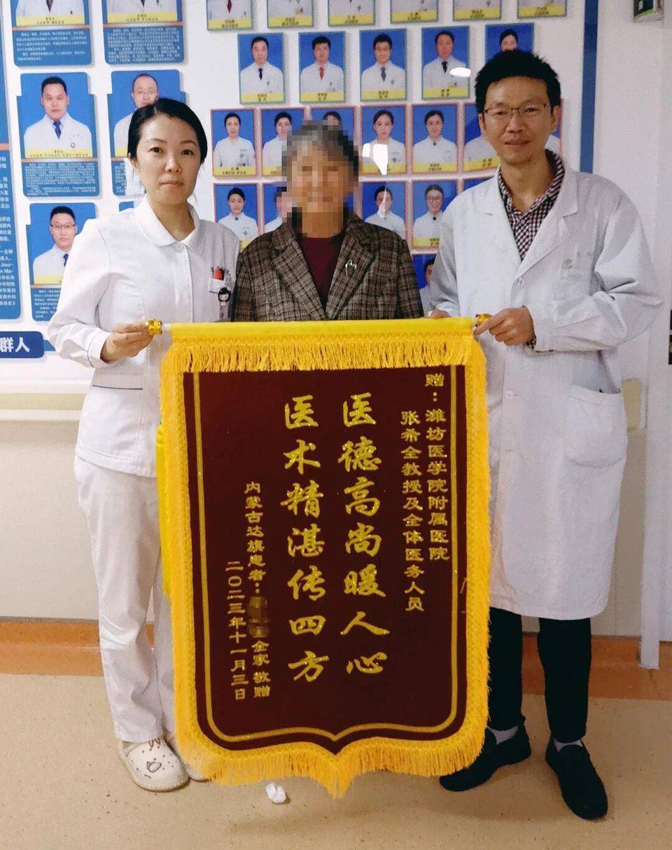 11月2日,在潍坊医学院附属医院导管室外,发生了这样感人的一幕:当潍坊医学院附属医院介入血管外科中心张希全教授带着从患者身上取出的滤器走出手术室,来自内蒙古包头市的刘女士先是欣喜的向张希全教授竖起大拇指,然后深深的鞠躬致谢,待抬起头来,泪水却早已打湿了眼眶... 这是一场源于信任而跨越1200公里的生命托付。