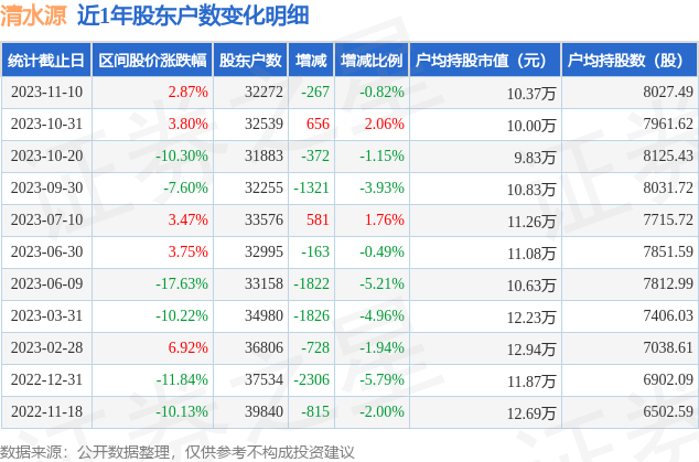 从股价来看,2023年10月31日至2023年11月10日,清水源区间涨幅为2.87%,在此期间股东户数减少267.0户,减幅为0.82%。