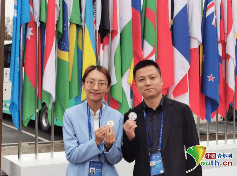 刘存钰(左)和联络员手持嘉宾赠予的勋章。受访者供图