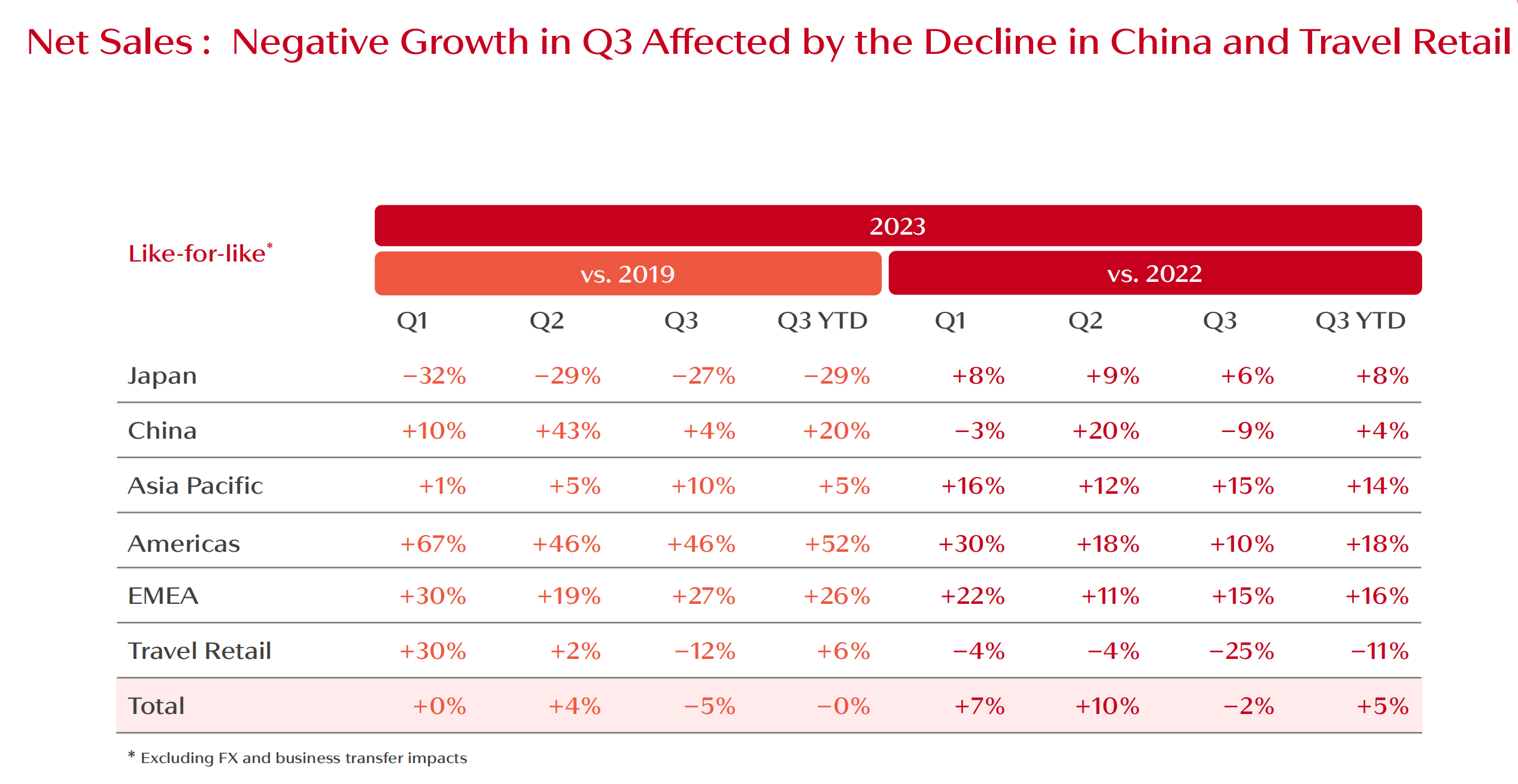 旅游零售市场方面,财报指出表示,韩国的库存有望在今年底前正常化;海南岛正在进行零售商库存调整,预计将在2024年第一季度末正常化,旅游活动恢复后市场正在常态化运作。