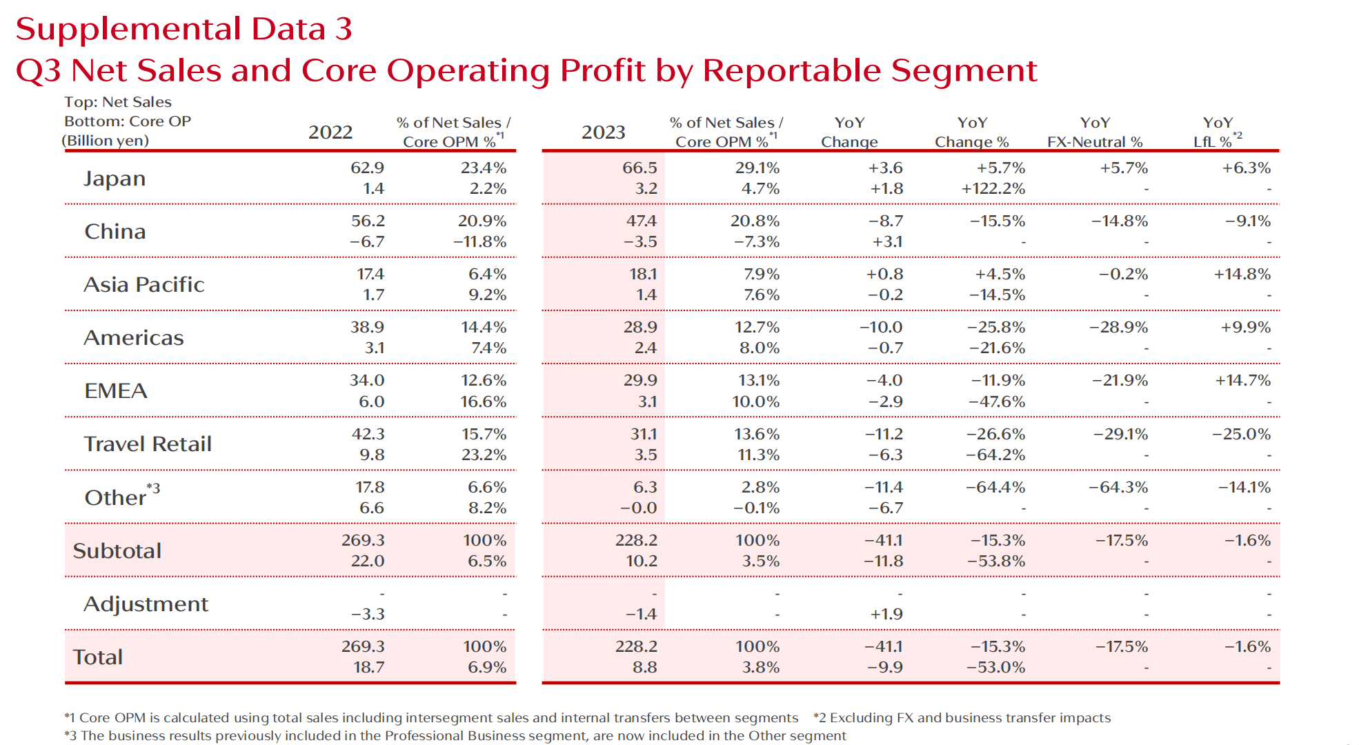 对于中国市场第三季度的遇冷,财报指出,一方面由于消费疲软,另一方面日本在宣布核废水排海后,中国消费者减少购买资生堂产品,导致第三季度净销售额同比下降,电子商务渠道的净销售额受到的影响最为显著。