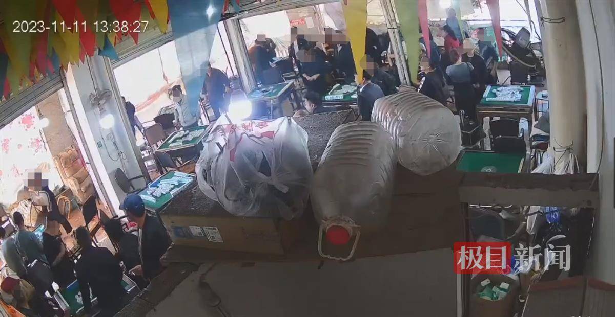 据麻将馆的监控视频显示,11月11日13时38分左右,麻将馆内有多人在打麻将,一男子满身是血,被两人持刀追砍。麻将馆内另有一名女子也被两名男子追砍,最后倒在地上。