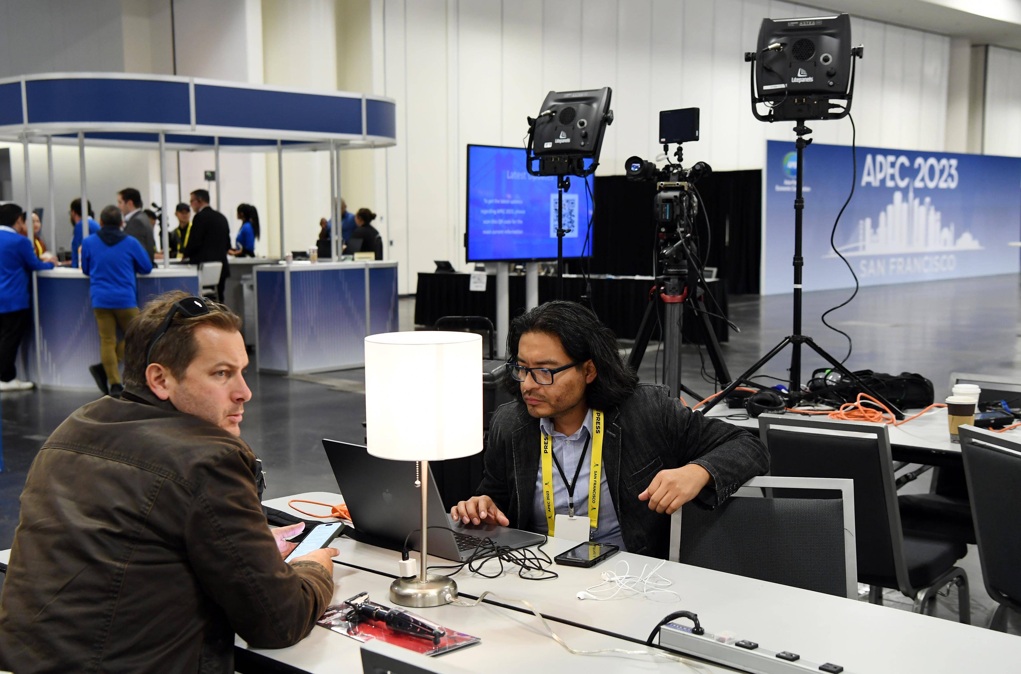 11月12日,记者在美国旧金山的2023年亚太经合组织会议国际媒体中心内工作。 新华社记者 李睿 摄