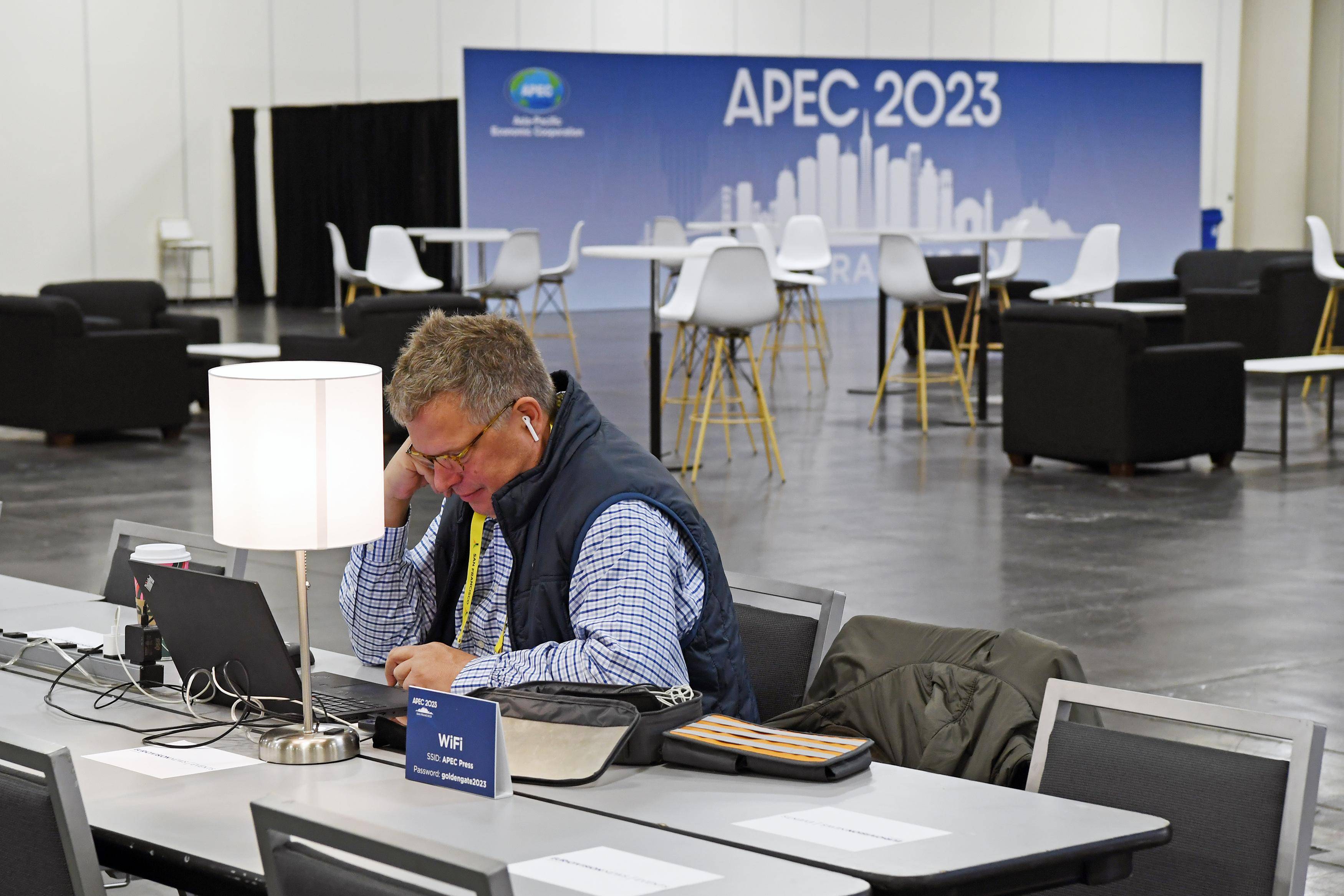 11月12日,一名记者在美国旧金山的2023年亚太经合组织会议国际媒体中心内工作。 新华社记者 李睿 摄