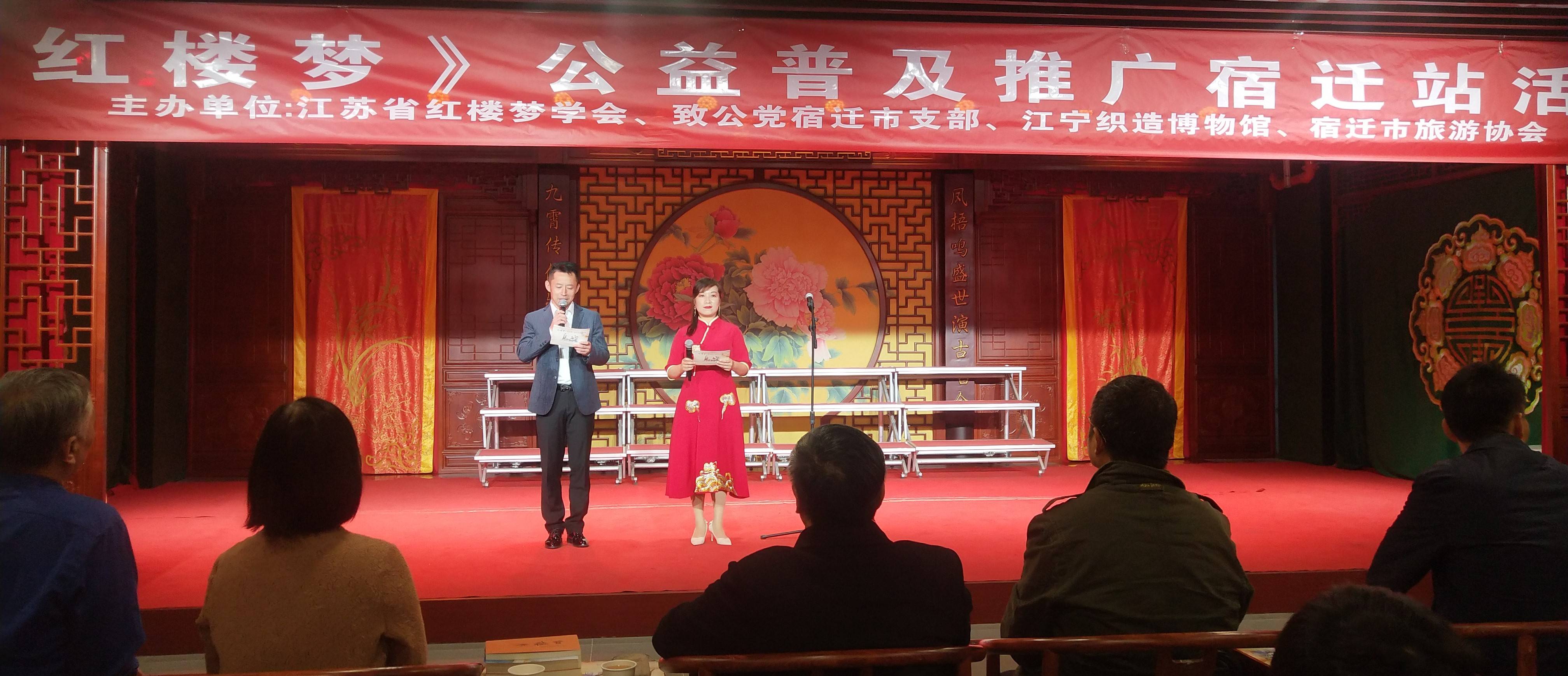 2023年11月12日,江苏省红楼梦学会前往宿迁市举办《红楼梦》普及推广公益活动,这次活动由江苏省红楼梦学会、江宁织造博物馆、宿迁市旅游协会联合主办,还得到了宿迁市新盛街文化旅游发展有限公司、宿迁市安徽商会、宿迁市戏剧家协会等单位大力支持和帮助。