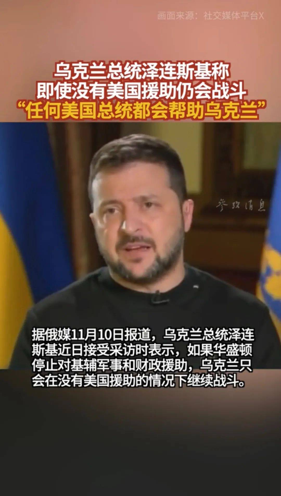 目前,俄乌军事冲突已经爆发626天。根据参考消息援引俄媒消息,当地时间11月10日,乌克兰总统泽连斯基接受了英国路透社采访,在被问及2024年美国总统大选、如果特朗普上台是否会对乌克兰军事行动造成影响时,泽连斯基立刻表示,是否有美国的援助“都不影响乌克兰军队继续战斗”,如果华盛顿停止对基辅的军事和财政援助,乌克兰军队就在没有美国援助的情况下作战。