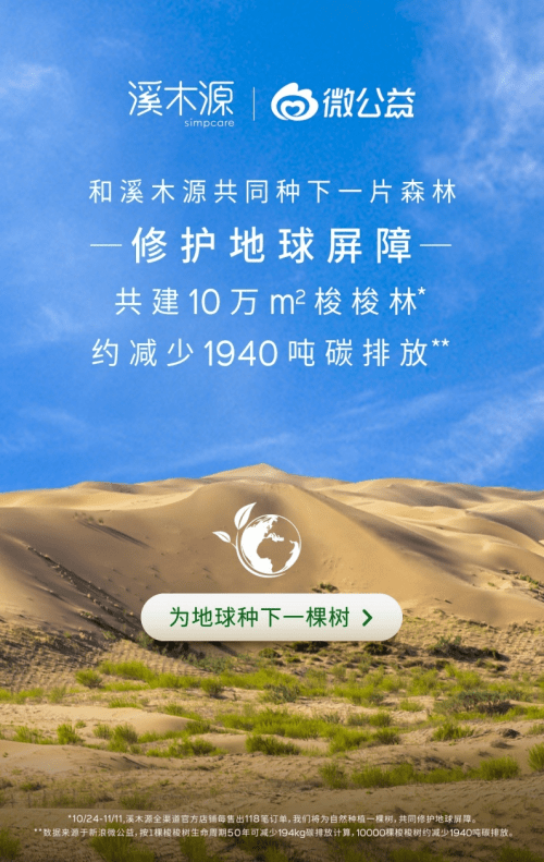 此次直播也正式揭开了“和溪木源共同种下一片森林,修护地球屏障”公益活动的序幕。活动由溪木源携手新浪微公益、共青团甘肃省委共同发起。在“双11”期间,溪木源全渠道每卖出118单,即为地球种下一棵梭梭苗。以“取之自然,回馈自然”的信念,用实际行动支持自然环境保护。