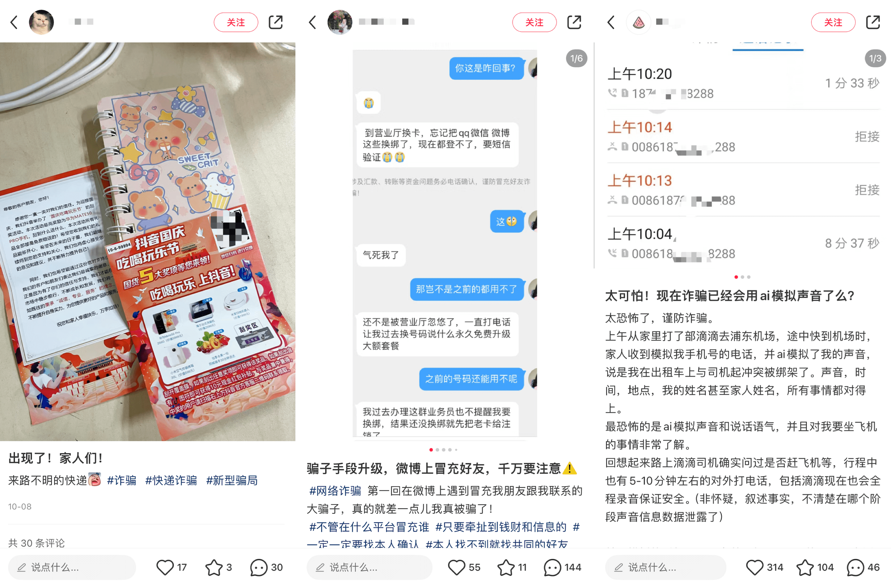 天!现在的网络诈骗真的是无孔不入了,拿个快递可能会被骗,看个微博可能被骗,甚至接到亲友的电话,也可能是个骗局。最近看到很多网友分享了新型骗局,有的是寄快递,里面可能有一些小礼品,以及还有相关海报,扫码就能参加活动,抓住了有人贪小便宜的心理,一旦扫码的话可能就会落入骗局。以及还有冒充微博好友、AI模拟声音等骗局,大家一定要注意下了。