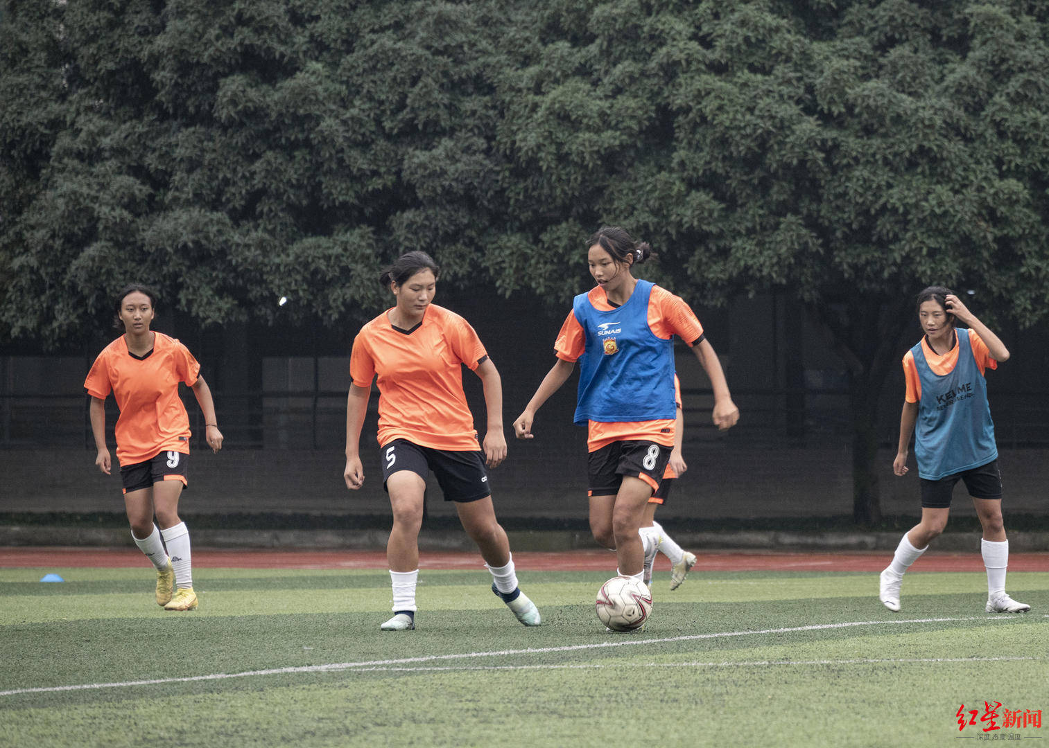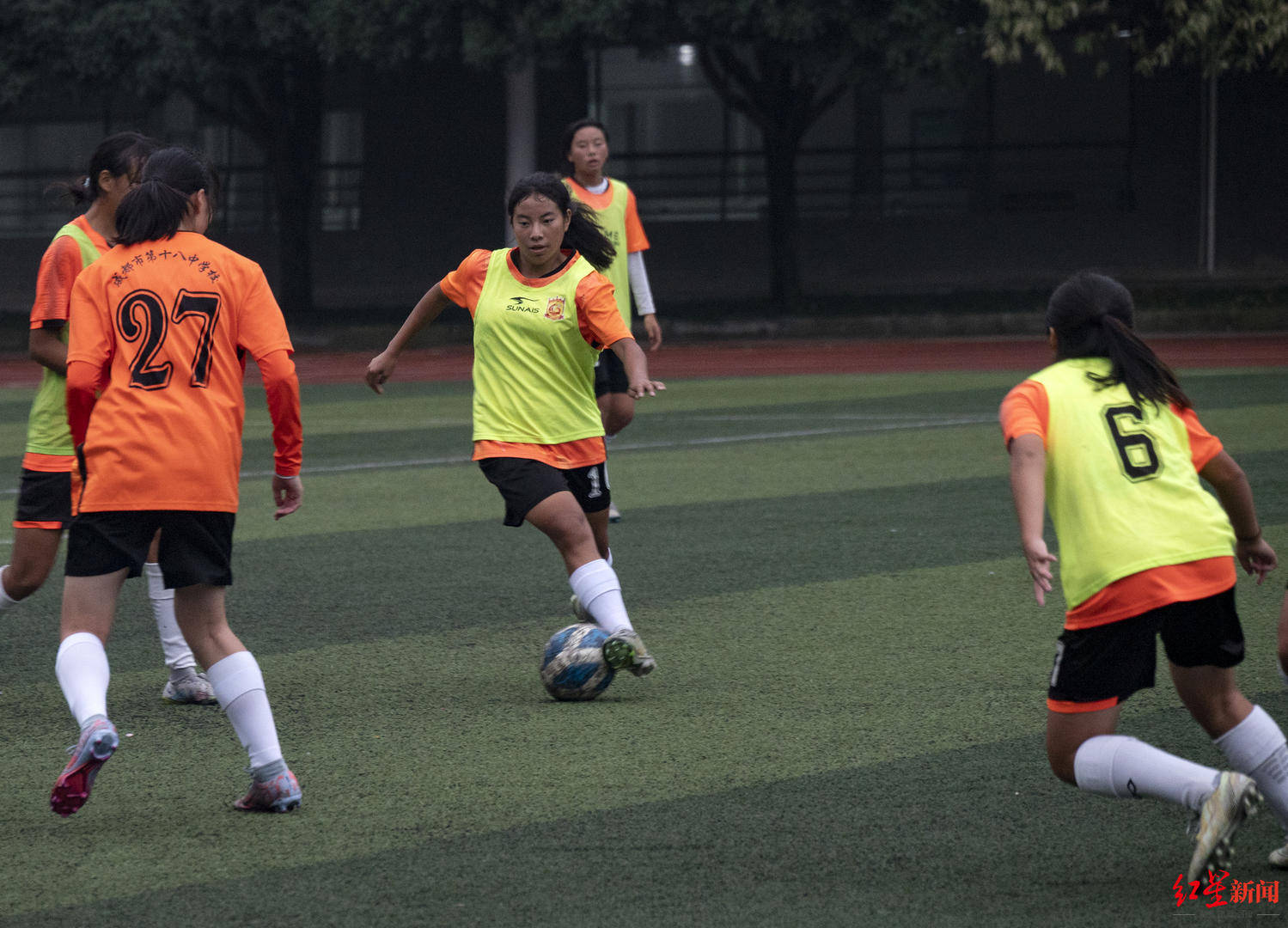 每一天傍晚,激烈的对抗都在成都十八中的绿茵场上演。一群彝族姑娘组成的球队很容易分辨出来,13位队员四肢颀长,肤色红棕,透着一股敢打敢拼的劲头。