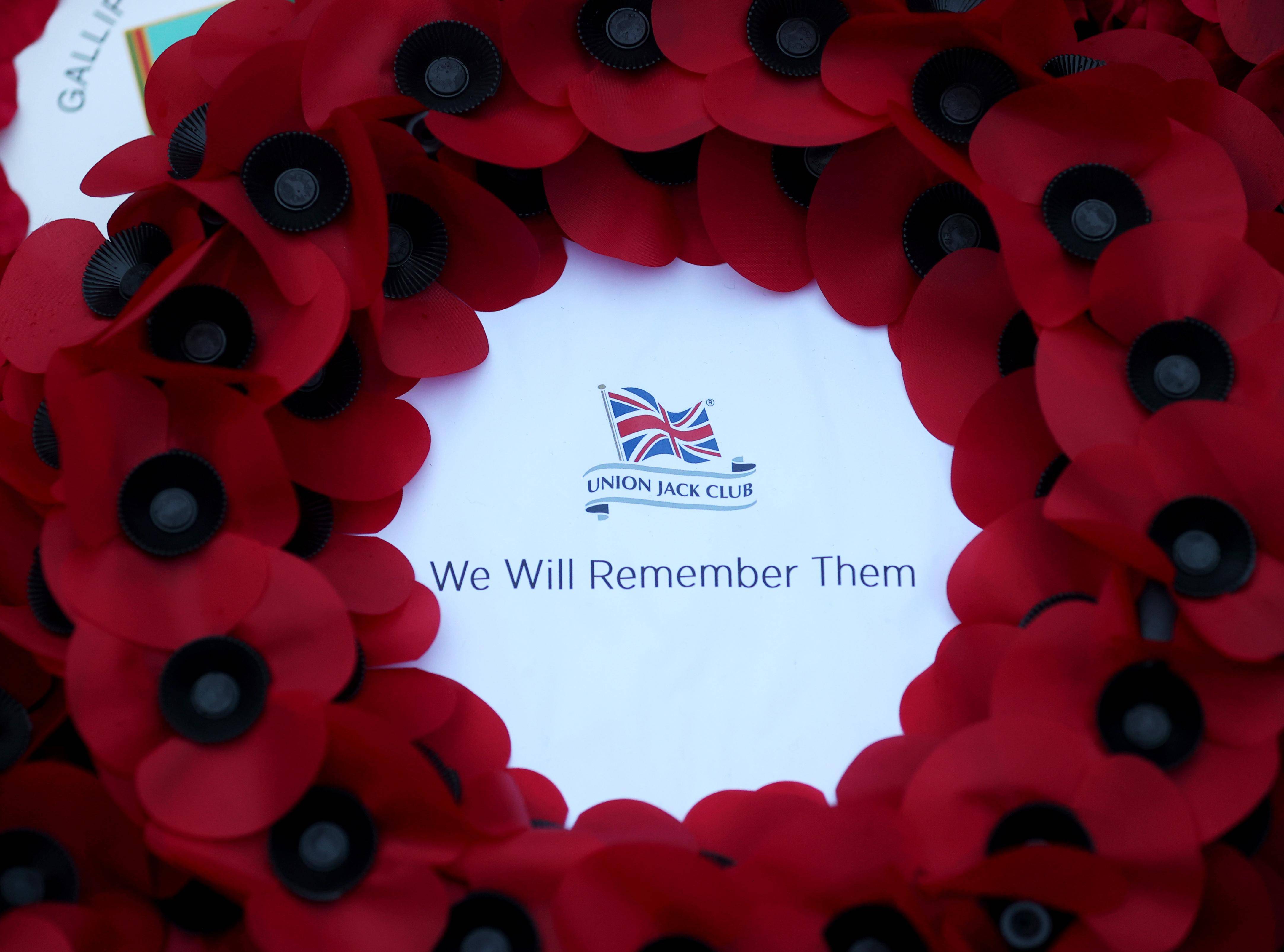 这是11月12日在英国伦敦和平纪念碑前摆放的悼念花圈。 新华社记者 李颖 摄