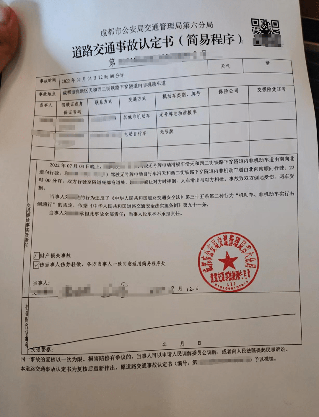 之后,交警出具了交通事故责任认定书:小文驾驶无号牌电动滑板车沿天和西二街铁路下穿隧道内非机动车道由南向北逆向行驶,小林驾驶无号牌电动自行车沿天和西二街铁路下穿隧道内非机动车道由北向南顺向行驶,双方行驶至隧道底部弯道处,小林避让对方时摔倒,人车滑出与对方相撞。小文承担此事故全部责任,小林不承担责任。此后,小文不认可这一认定并提起行政复议。不久后,成都交管局复核结论,原认定事实不清、适用法律错误,责令原办案单位重新调查、认定。