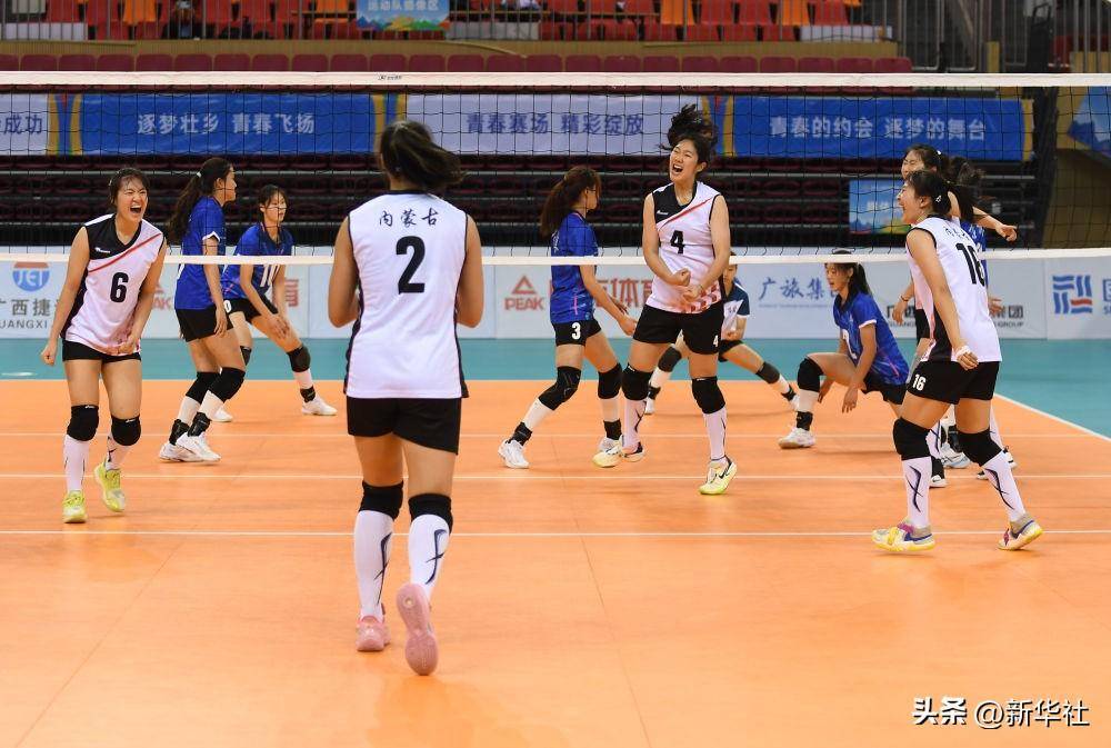 ↑2023年11月9日,代表内蒙古队参加第一届学青会的包头市第一中学女排队员在对阵吉林队的小组赛中庆祝得分。新华社记者 侯昭康 摄