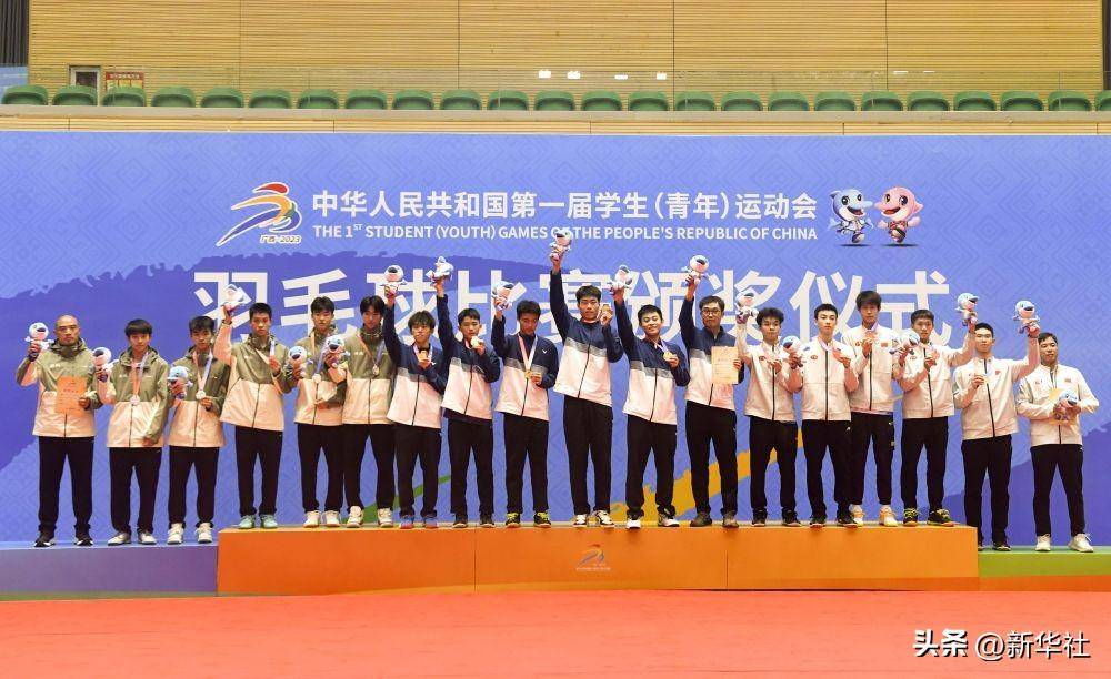 ↑2023年10月24日,冠军湖南队(中)在学青会羽毛球中学组男子团体决赛颁奖仪式上。新华社记者 陆波岸 摄
