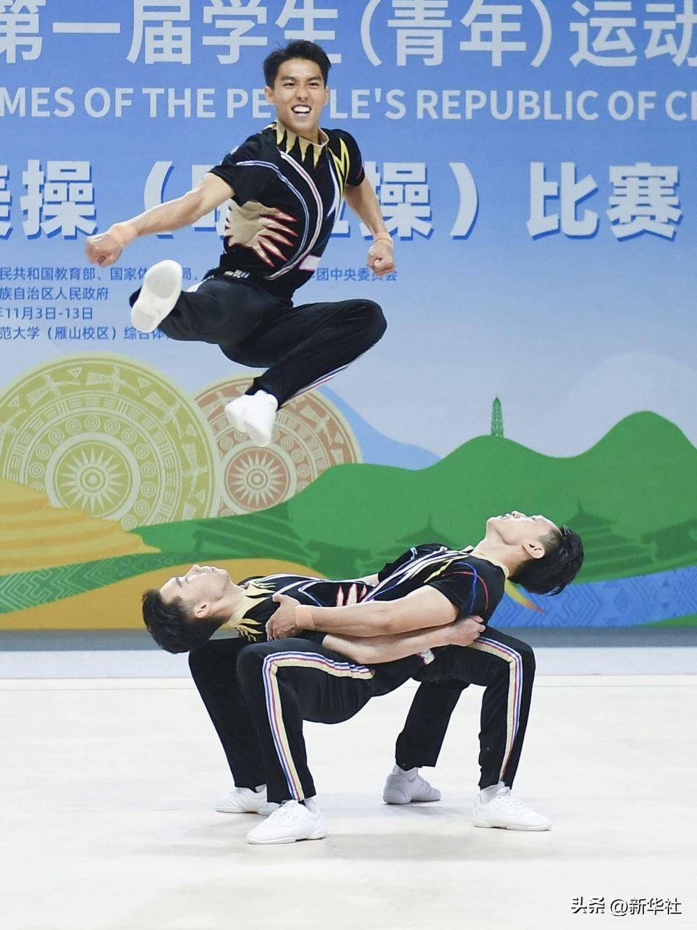 ↑2023年11月6日,代表上海队的华东师范大学组合梁文杰(上)/滕浩(右)/范思伟在健美操大学组三人操决赛中获得季军。新华社记者 侯昭康 摄