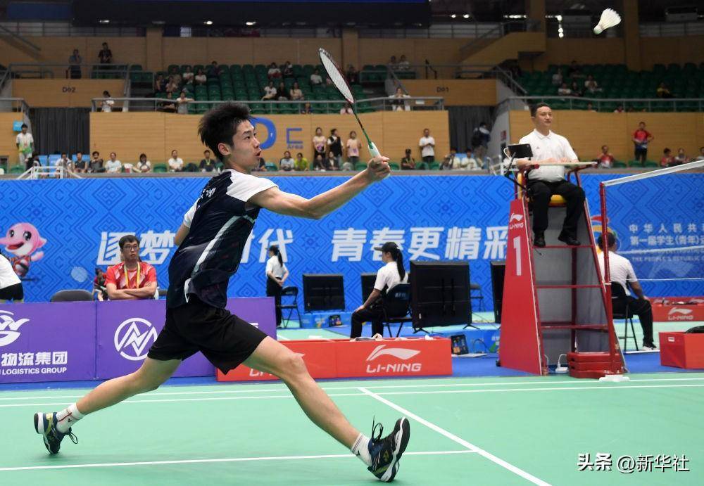 ↑2023年10月24日,代表湖南队的长沙市南雅中学选手袁璁颢在学青会羽毛球中学组男子团体决赛单打比赛中回球。新华社记者 陆波岸 摄