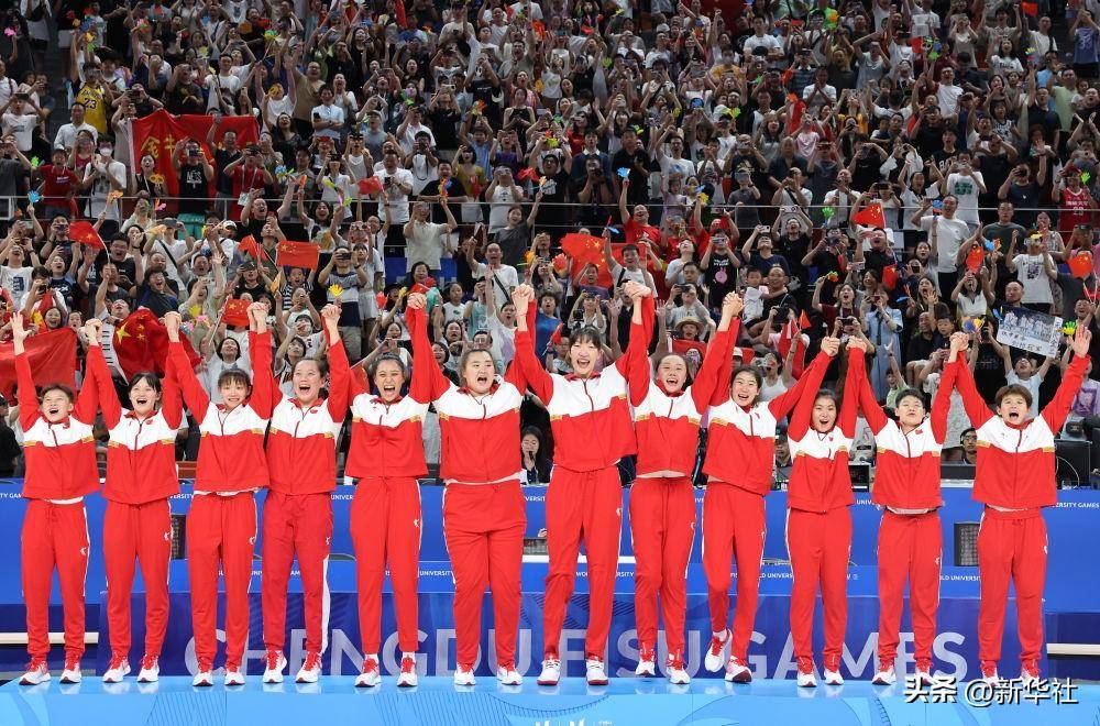 ↑2023年8月5日,成都大运会女篮冠军中国队登上领奖台。新华社记者 杨青 摄