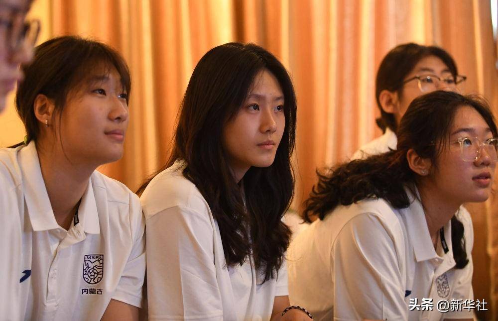 ↑2023年11月9日,代表内蒙古队参加第一届学青会的包头市第一中学女排队员李亚泽、张旭阳、刘依凝(左至右)在赛前准备会观看对手录像。三人今年已分别被华东师范大学、华中师范大学和北京航空航天大学录取。由于女排比赛延期,三人此次可以代表高中母校参赛。新华社记者 侯昭康 摄