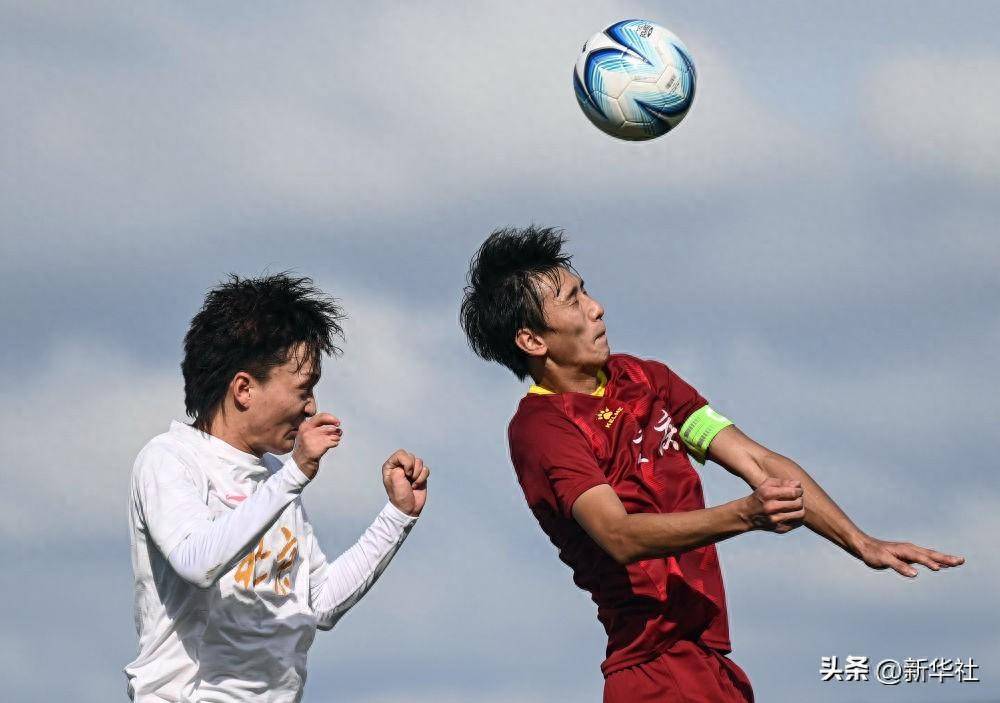 ↑2023年11月8日,在学青会足球大学男子组小组赛中,北京理工大学球员李翔宇(左)同重庆队球员向骏争顶。新华社记者 张爱林 摄
