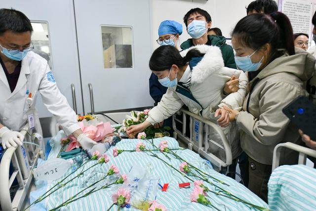 家人和医护人员向孩子献上鲜花。拍友 沈云建 摄
