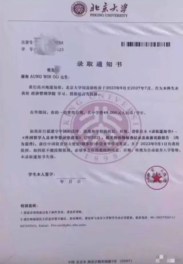 记者从网传“北京大学录取通知书”截图看到:“缅甸明光忠,我们高兴地通知你,北京大学同意接受你于2023年9月至2027年7月,作为本科生来我校经济管理学院学习,授课语言为汉语……”另外,还有多张明学昌与明光忠在“升学宴”上的庆祝图片。