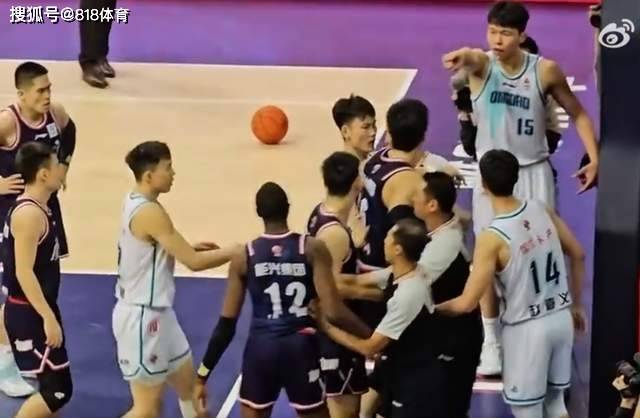 广州队小将焦泊乔上前要为坎普出头和杨瀚森对线,被裁判死死拦住了。