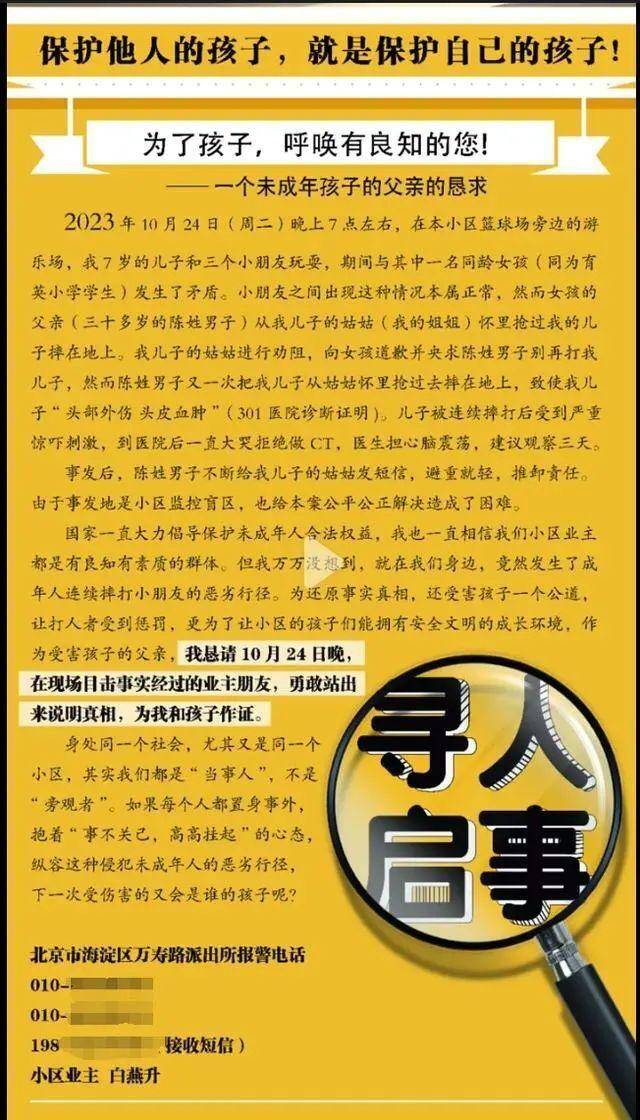 据白燕升介绍,两次抱摔导致儿子“头部外伤、头皮血肿”,且受到惊吓刺激。由于事发地是小区监控盲区,也给本案公平公正解决造成了困难。10月26日,白燕升在小区内发布寻人启事,寻找目击者为孩子作证。