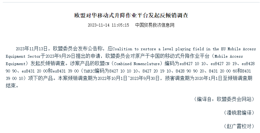 上证报中国证券网讯 据中国贸易救济信息网11月14日消息,2023年11月13日,欧盟委员会发布公告称,应Coalition to restore a level playing field in the EU Mobile Access Equipment Sector于2023年9月29日提出的申请,欧盟委员会对原产于中国的移动式升降作业平台(Mobile Access Equipment)发起反倾销调查。涉案产品的欧盟CN(Combined Nomenclature)编码为ex8427 10 10、ex8427 20 19、ex8428 90 90、ex8431 20 00和ex8431 39 00(TARIC编码为8427 10 10 10、8427 20 19 10、8428 90 90 20、8431 20 00 60和8431 39 00 10)项下的产品。本案倾销调查期为2022年10月1日~2023年9月30日,损害调查期为2020年1月1日至倾销调查期结束。