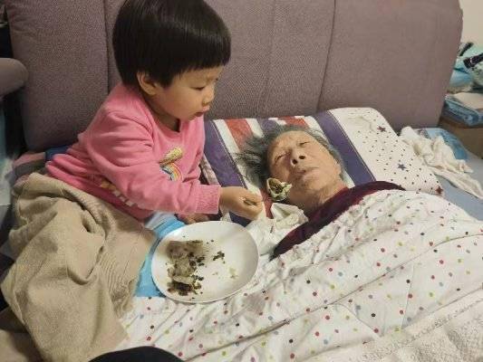 在她的耳濡目染下,不到两岁的小外孙女也会抢着去给老姥姥喂水喂饭、按摩、擦嘴、讲故事、跳舞。婆婆有时候看到儿媳照顾自己还照顾着小孩子,会偷偷掉泪、怪自己寿命太长拖累了儿媳,而王汝美总会宽慰婆婆“有你我还能当个孩子,还觉得年轻呢。”殊不知,她自己也是60好几的人了。