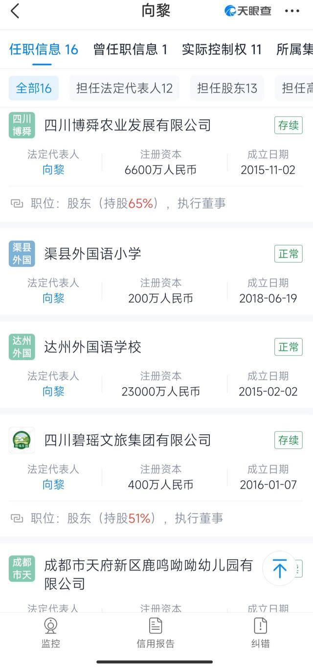 天眼查显示,向黎曾是达州外国语学校校长,曾入股16家企业。