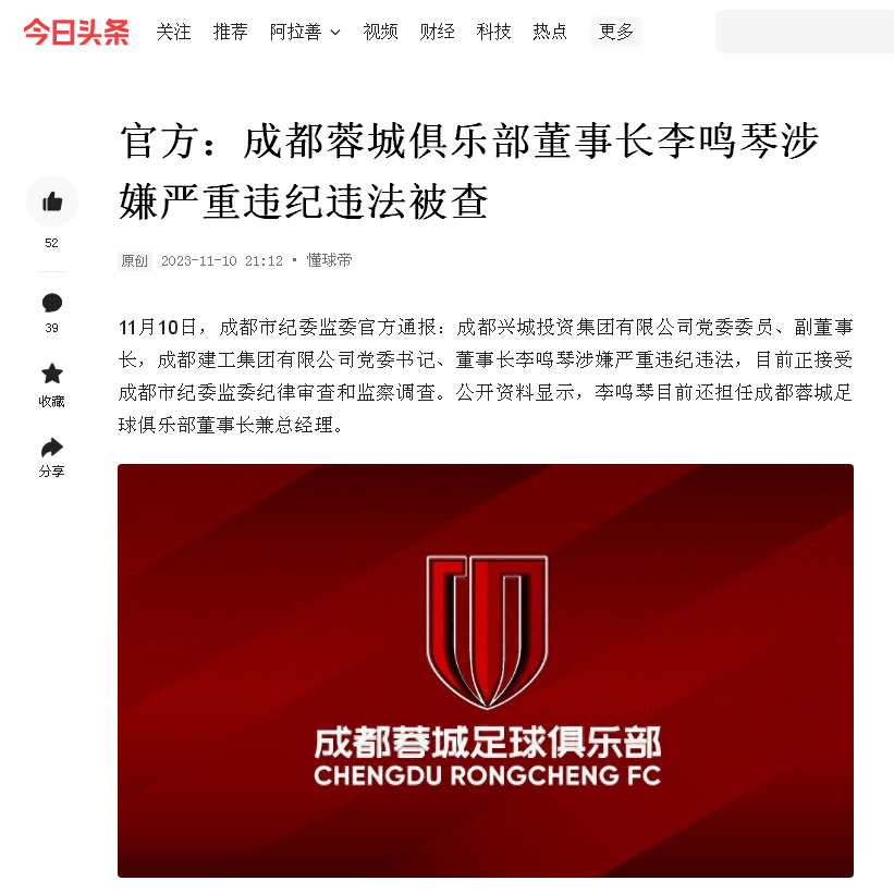 11月10日晚,媒体爆料称成都建工集团有限公司董事长李鸣琴涉嫌严重违纪违法,目前正接受成都市有关方面纪律审查和监察调查。而有资料显示,李鸣琴同时也是成都蓉城足球俱乐部董事长兼总经理。