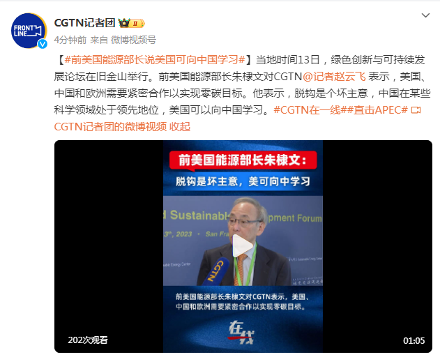 当地时间13日,绿色创新与可持续发展论坛在旧金山举行。前美国能源部长朱棣文对CGTN@记者赵云飞 表示,美国、中国和欧洲需要紧密合作以实现零碳目标。他表示,脱钩是个坏主意,中国在某些科学领域处于领先地位,美国可以向中国学习。