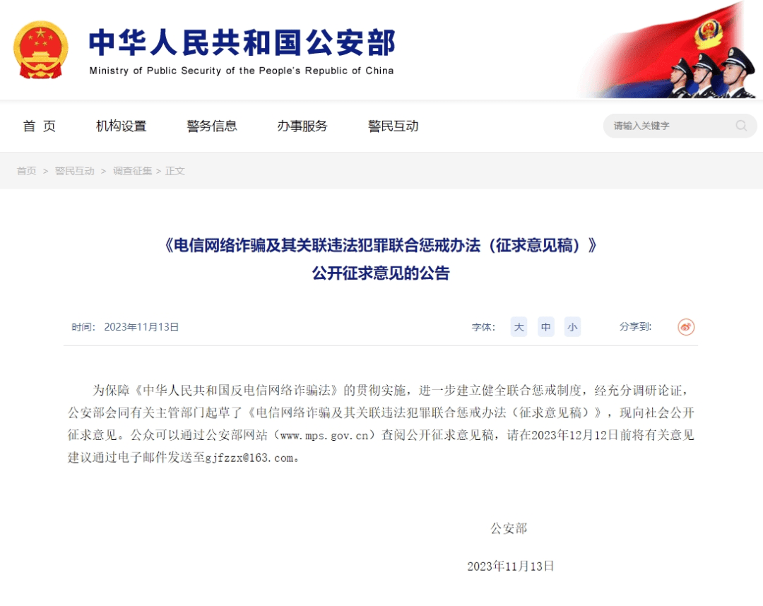 点击“https://www.mps.gov.cn/n2254536/n4904355/c9288546/content.html”,可查看《电信网络诈骗及其关联违法犯罪联合惩戒办法(征求意见稿)》。公众可在2023年12月12日前将有关意见建议通过电子邮件发送至gjfzzx@163.com。详见↓