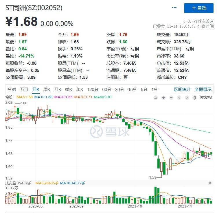 二级市场上,截至14日收盘,报1.68元/股,总市值12.53亿元。