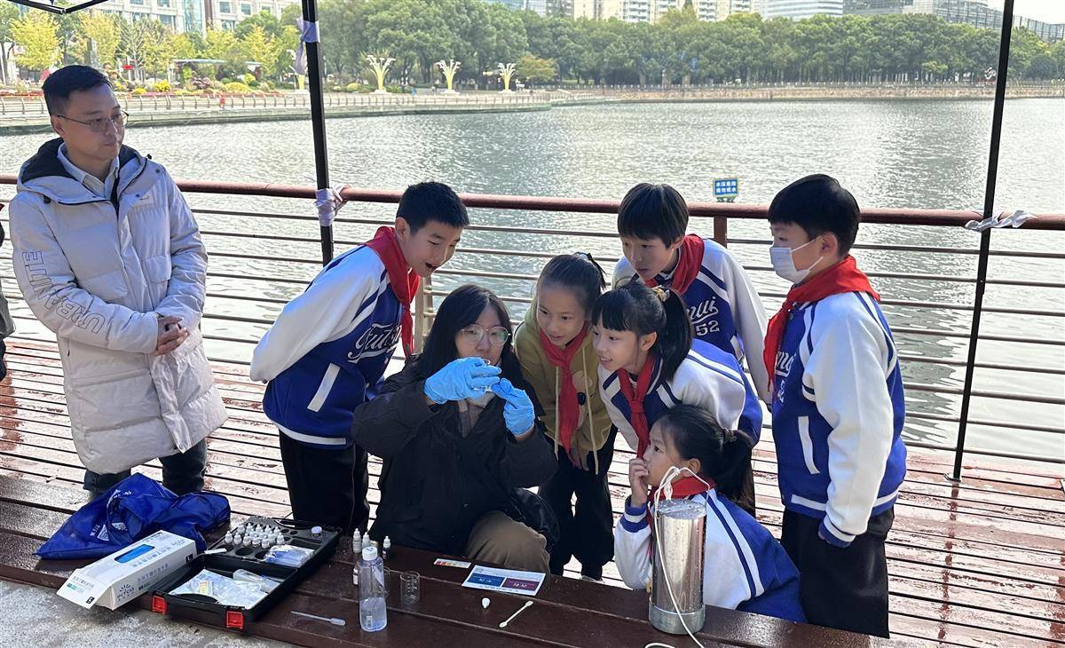 观摩学习后,武汉爱我百湖志愿者协会工作人员带领大家来到西湖边,用专业取水仪器提取湖水,供小小河湖长们开展简易水质检测小实验。他们利用刚刚在技能大赛中学到的办法,检测氨氮、溶解氧、pH值等指标,并通过各项指标分析水质状况。