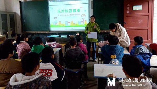 11月14日,双峰县锁石镇社工站的志愿者来到大街小学,开展反对校园霸凌的宣传教育活动,教育孩子们向校园霸凌坚决说“不”,为孩子们构筑“防霸”墙,注射“防霸”针。