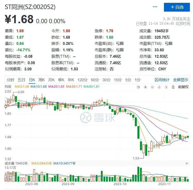 二级市场上,截至14日收盘,ST同洲报1.68元/股,总市值12.53亿元。