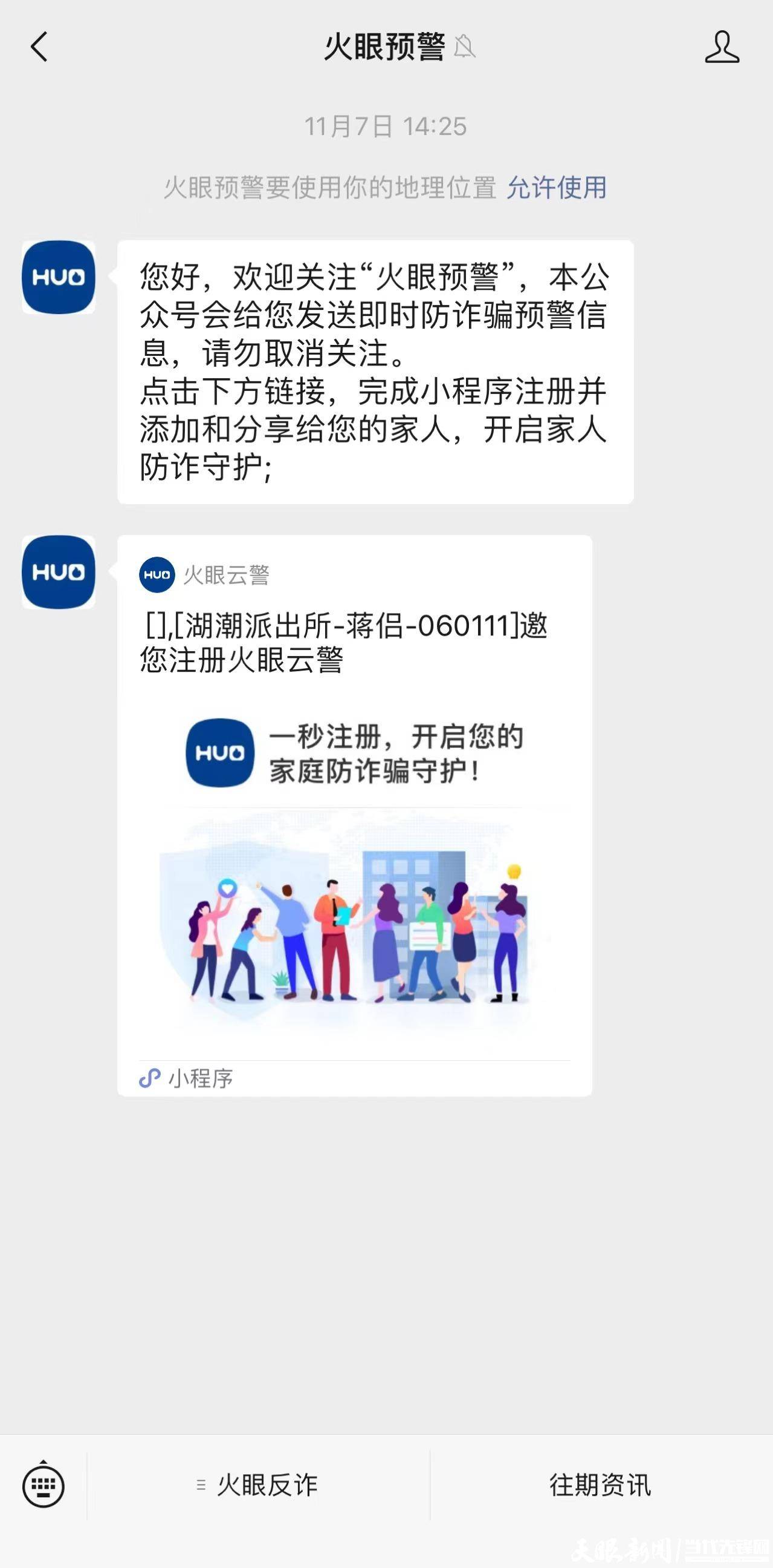 在得到对方肯定答复后,蒋侣挂完电话向记者介绍,“火眼预警”是一款反诈小程序,在日常走访中,社区民警通过让群众扫码添加程序注册账户,“注册后,只要是群众收到诈骗电话或诈骗信息,系统都会及时反馈给社区民警,让我们能第一时间劝阻潜在受骗者,提高预警劝阻效率和劝阻成功率。”