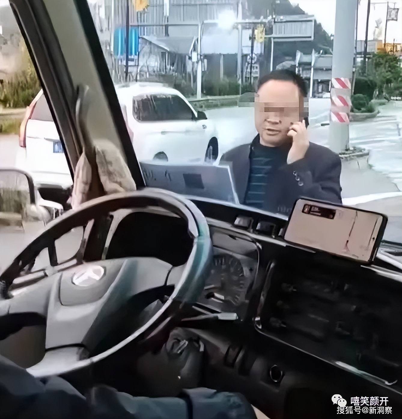 男子出门在外不想惹事,并未与小车争吵。然而,到达路口时,白色小车突然刹车,强行逼停男子的大巴车。