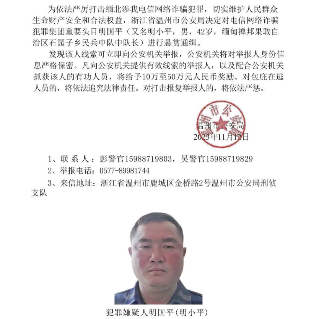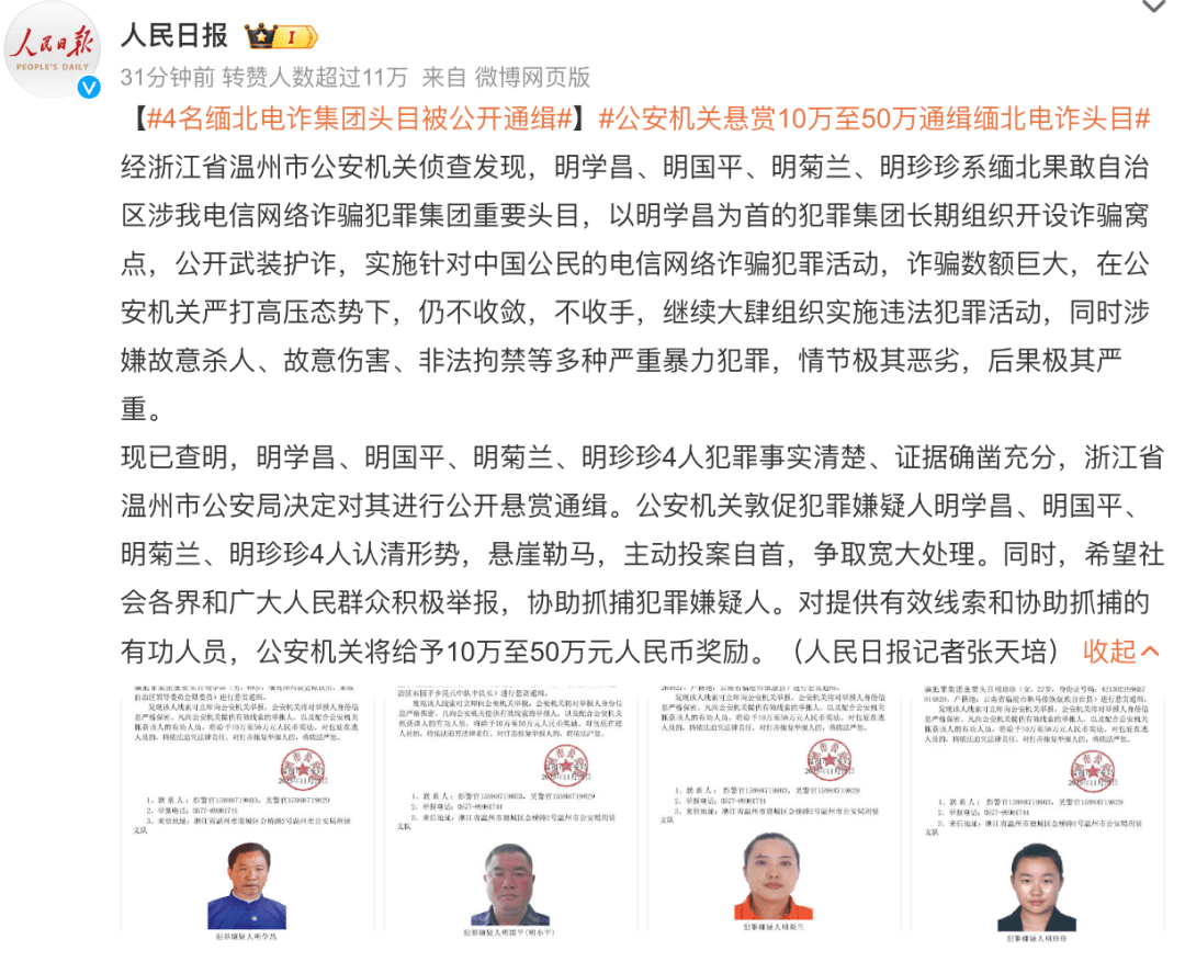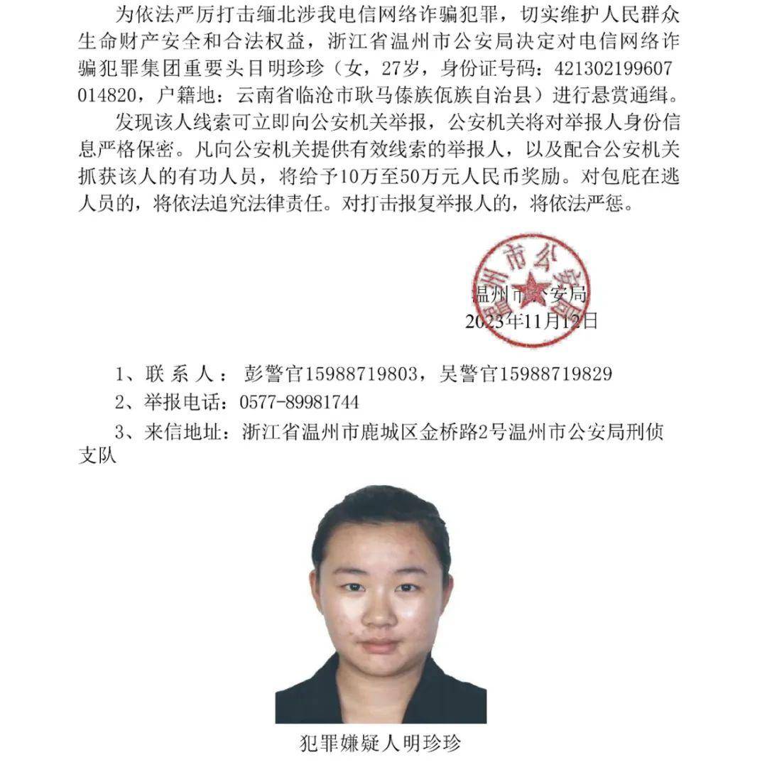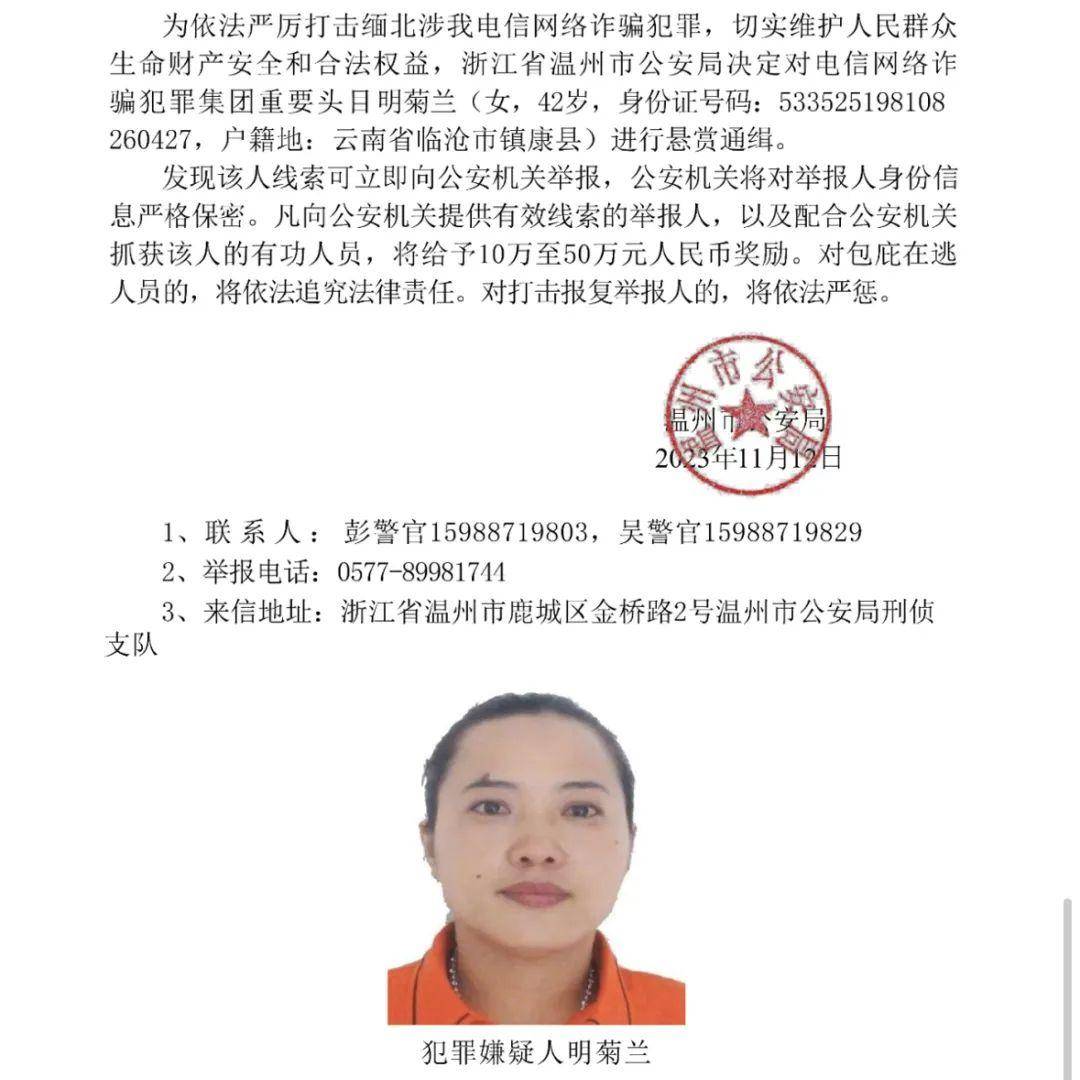 11月12日下午,公安部刑侦局公众号发布消息,公安机关公开通缉明学昌、明国平、明菊兰、明珍珍4名缅北果敢自治区电信网络诈骗犯罪集团重要头目。