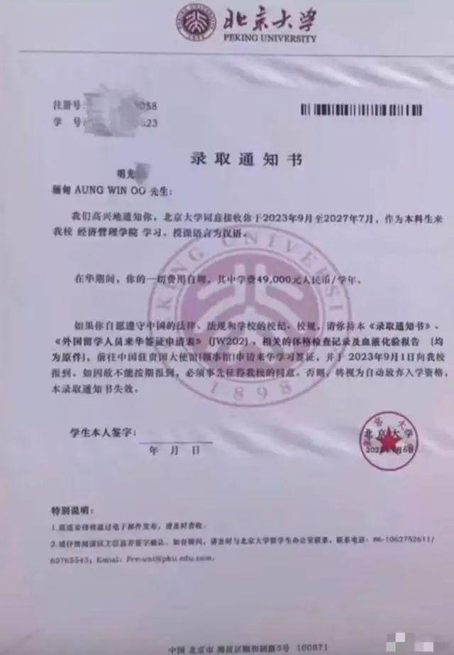 从网传“北京大学录取通知书”截图可以看到:“缅甸明光忠,我们高兴地通知你,北京大学同意接受你于2023年9月至2027年7月,作为本科生来我校经济管理学院学习,授课语言为汉语……”
