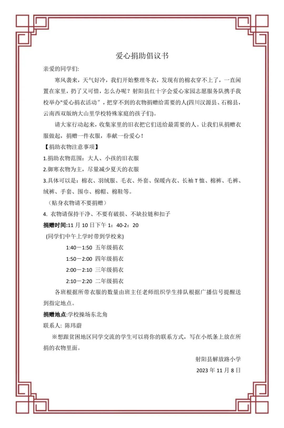 公益不止,爱心不息。11月10日,射阳县红十字会携手射阳县解放路小学举行“爱心捐衣送温暖”公益活动,将温良善意送至偏远地区每一位贫困的孩子手中,将爱传递。