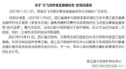 经初步调查,2023年11月6日,四川省阆中市居民李某华委托巴中市南江县赤溪镇金银村村民王某国(李某华之母)请高塔镇射洪寨村民岳某邦对石飞河部分摩崖造像涂色“穿衣还愿”。事件发生后,当地立即对现场增加了保护措施,防止不当行为造成二次损害。同时,公安机关正在依法开展调查。