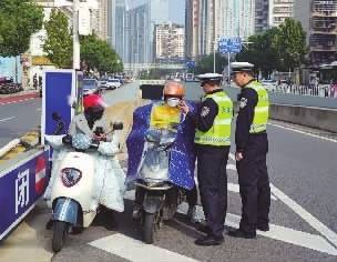 11月14日,长沙南湖路上南湖路隧道出口,交警拦下从隧道驶出的电单车。