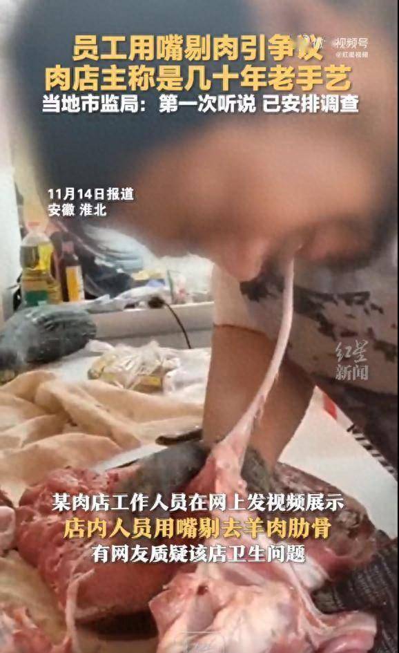 11月14日,安徽淮北。某肉店工作人员在网上发视频展示,店内人员用嘴剔去羊肉肋骨,有网友质疑该店卫生问题。