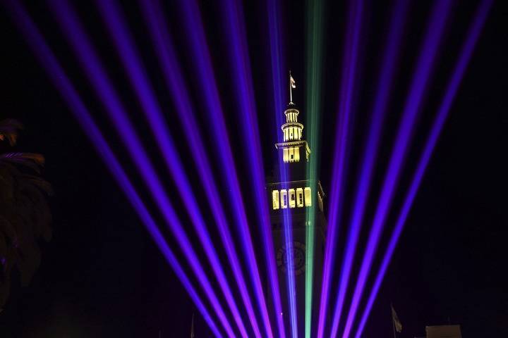 11月13日,旧金山市场街为迎接APEC举行灯光秀。(美联社)