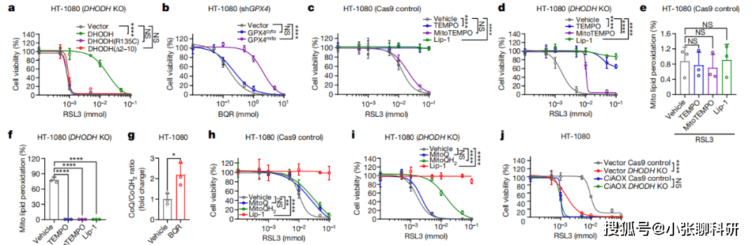 而对于GPX4到底在细胞质发挥功能还是在线粒体中一样发挥功能的问题,作者回应已经做了蛋白定位实验,确定PGX4在线粒体中的亚型是存在且有功能的,而遗传学方法干预的DHODH在普遍情况下也能获得提高铁死亡敏感性的结果。