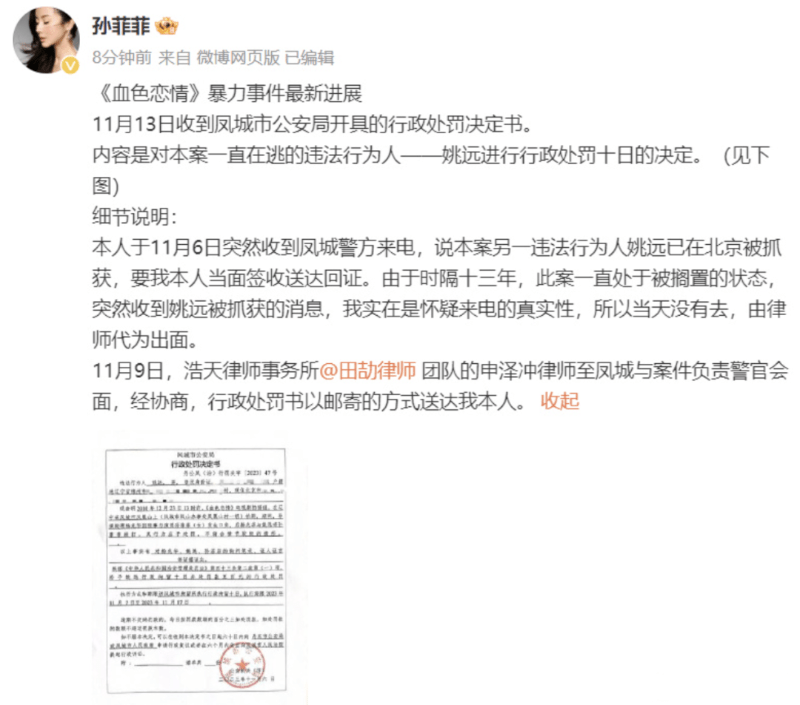 孙菲菲在微博中讲述了有关情况:“本人于11月6日突然收到凤城警方来电,说本案另一违法行为人姚远已在北京被抓获,要我本人当面签收送达回证。由于时隔十三年,此案一直处于被搁置的状态,突然收到姚远被抓获的消息,我实在是无法确认来电的真实性,所以当天没有去,由律师代为出面。11月9日,北京浩天律师事务所的申律师至凤城与案件负责警官会面,经协商,行政处罚书以邮寄的方式送达我本人。”
