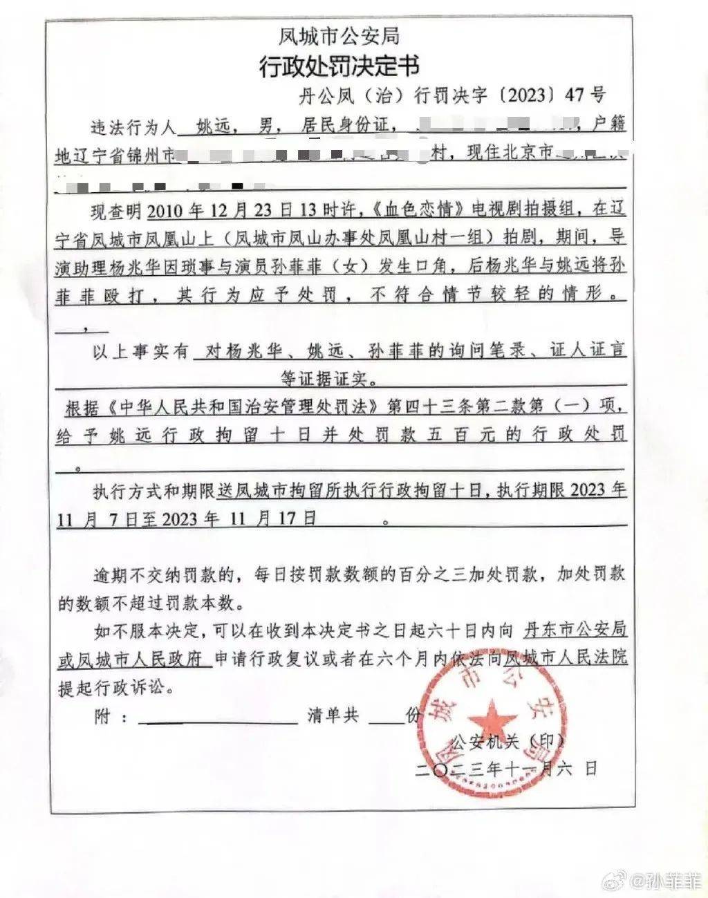11月14日,女演员孙菲菲晒出自己遭遇的《血色恋情》剧组暴力事件最新进展:辽宁丹东凤城市公安局开具的行政处罚决定书显示,该局对姚某作出行政拘留十日并罚款五百元的决定。